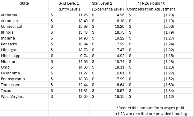 Under the new Rule the AEWR’s will be based on state-level wage data from the Bureau of Labor Statistics Occupational Employment and Wage Statistics Survey (OEWS). The Rule sets two skill-based AEWR Wages for differences in duties and compensation. DOL will assign skill-based wages based on the duties for most of the workdays and qualifications/experience required. Most general farm labor will be Skill Level 1.